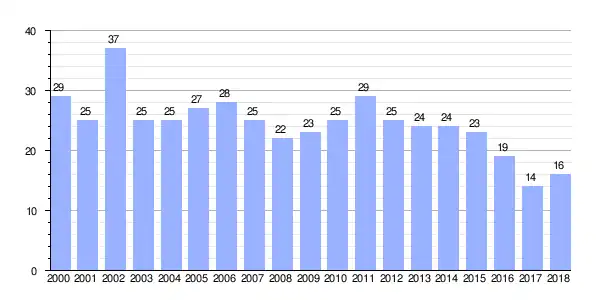 | Gráfica de evolución demográfica de Cabreiros entre 2000 y 2018 |