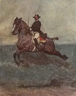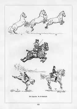 - ↑ Según la tercera acepción del Diccionario de la Real Academia, se dfine como 3. f. Salto que da el caballo, soltando un par de coces mientras se mantiene en el aire. Real Academia Española. «Cabriola». Diccionario de la lengua española (23.ª edición).