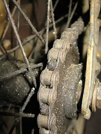 La cadena alternada utilizada en las bicicletas tiene el mismo espaciado de una pulgada que la cadena de bloques anteriormente utilizada. Debido a su asimetría, los rodillos se ajustan a los dientes largos utilizados con las antiguas cadenas de bloques, pero debido al uso de rodillos, su eficacia es mejor. La cadena alternada normalmente se dispone con las placas largas y las placas externas espaciadas, lo que visualmente la hace similar a una cadena de bloques. Dado que los dientes de la rueda dentada se desplazan sobre rodillos, no pueden ser más anchos que el ancho de los eslabones de los espacios estrechos, por lo que el diente no puede ser más ancho que con una cadena simétrica. Por lo tanto, la cadena de eslabones se desgasta más por engranar en la mitad del número de dientes y tiene una durabilidad de la rueda dentada peor que una cadena de rodillos simétrica. El desgaste de la cadena está dominado por el desgaste entre los pasadores y los bujes, y en esto coincide con una cadena de rodillos moderna.