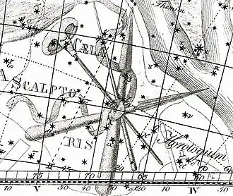 ![]() Carta celeste de la constelación del Cincel en la que aparecen sus principales estrellas. | ||