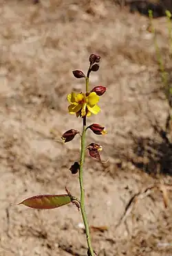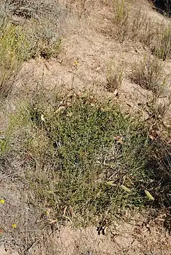 Es un arbusto caducifolio en verano de hasta 1 m de alto, globoso, de ramas erectas, angulosas y glabras. Hojas bipinnati-compuestas, 2-3 pares de pinnas, éstas, a su vez, con 5 a 8 pares de folíolos elípticos, glabros. Las flores se disponen en racimos laxos terminales de 10-15 cm de largo. Cáliz con 5 sépalos de color rojo oscuro; corola con 5 pétalos amarillos, el superior con manchas o líneas rojas; androceo 10 estambres. El fruto es una legumbre 4-6 cm de largo, plana, roja oscura, con glándulas negras, que pasa a café clara al madurar; tiene 2 a 3 semillas acorazonadas; maduran a fines de primavera y comienzos del verano.[2]