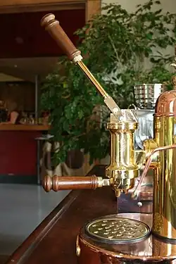 La variante de pistón, o de manivela, fue desarrollada en Italia en 1945 por Achille Gaggia, fundador del fabricante de cafeteras expreso Gaggia.[19] El diseño utiliza usualmente una manivela, accionada a mano, con el objetivo de presurizar agua caliente y enviarla a través del café molido.[20][21]