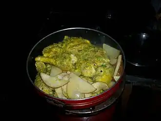 | Ingredientes | Pollo, chile verde, cilantro, cebolla, ajo, jengibre, canela, pimienta, guindilla, macis, clavo en polvo, jugo de lima y vinagre | |