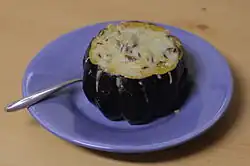 Una calabaza de bellota rellena de arroz pilaf y gratinada con queso.