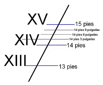 La lectura de las escalas de calados se realiza de acuerdo con lo siguiente: el pie del número indica el calado, y la altura del número es un decímetro o medio pie (6 pulgadas), según el caso; por tanto, las posiciones se obtienen proporcionalmente. Para relacionar ambas escalas, se indican las equivalencias entre pies, pulgadas y centímetros.[cita requerida]