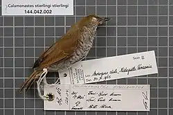 - ↑ BirdLife International (2016). «Calamonastes stierlingi». Lista Roja de especies amenazadas de la UICN 2017.3 (en inglés). ISSN 2307-8235. Consultado el 21 de julio de 2018.