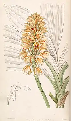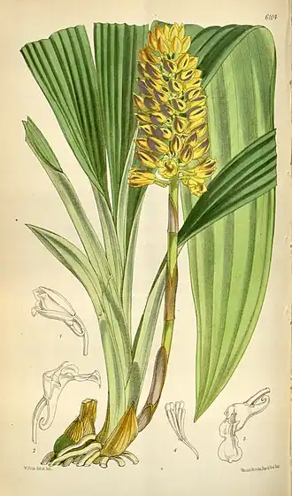 Es una orquídea de tamaño mediano a grande, de hábito terrestre y con pequeños pseudobulbos muy juntos, que están envueltos por vainas de las hojas y que llevan de 5 a 6 hojas, elípticas, acuminadas, plegadas, estrechándose gradualmente abajo en la base peciolada alargada. Florece durante la primavera en una inflorescencia racemosa de 50 a 60 cm de largo, erguida, sin pelos, con 40 a 110 flores, con grandes brácteas florales agudas, lanceoladas, muy cóncavas que caen antes que las flores sin olor se abran.[1]