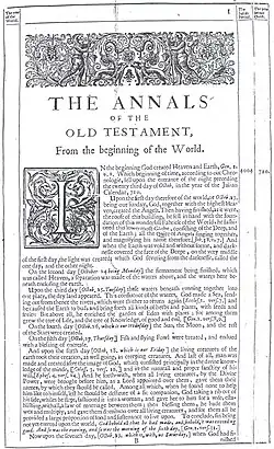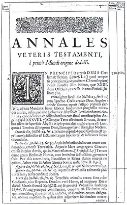 Ussher indicó su fecha para la Creación (noche precedente al 23 de octubre) en la primera página de los Annales en latín y en la primera página de su traducción inglesa Annals of the World (1658). La versión siguiente del inglés se basa en ambos, con un grave error en la versión inglesa de 1658, corregida refiriéndose a la versión latina.