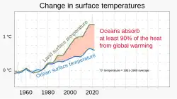 El calor que absorben los océanos representa más del 90% de la absorción total del calor que hay en el planeta como consecuencia de los cambios inducidos por los humanos en la composición de la atmósfera terrestre.[13][35] Este alto porcentaje se debe a que las aguas en la superficie del océano y debajo de ella -especialmente la turbulenta capa superior mixta- poseen una inercia térmica mayor que la corteza continental expuesta del planeta, las regiones polares, o la atmósfera. Un cuerpo con gran inercia térmica almacena una gran cantidad de energía debido a su capacidad calorífica volumétrica y transmite energía eficazmente según su coeficiente de transferencia de calor. Gran parte de la energía adicional que ingresa al planeta a través de la atmósfera es absorbida y retenida en el océano.[36][37]