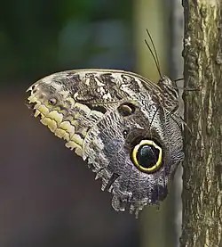 En cualquier caso se considera que los ocelos forman parte de una estrategia de cripsis que protege a las mariposas. Algunas especies vuelan solamente unos pocos metros para evitar exponerse a los pájaros. Las mariposas búho tienen hábitos crepusculares y son pocos los pájaros activos a las mismas horas que ellas, por lo cual sus principales depredadores son aparentemente lagartijas tales como las del género Anolis. Se ha sugerido que los ocelos de las mariposas búho tratan de semejar la cabeza de las ranas Hyla a las que temen los Anolis. Esta hipótesis tampoco ha sido probada, pero es cierto que los ocelos sirven a varias especies para protegerse de los depredadores.[4]