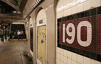 La Calle 190 (originalmente llamada 190th Street–Overlook Terrace en inglés), localizada en la Avenida Fort Washington o entre alrededor de 240 metros (260 yardas) al norte de la calle 190, la estación tiene dos vías y dos plataformas en la cual funciona con los trenes A todo el tiempo. La estación está cerca de Fort Tryon Park y la madre Francisca Javiera en Hudson Heights barrio de Washington Heights. The Cloisters del Museo Medieval de Artes, una marca del Museo de Arte Metropolitano, está localizado en el parque, a unos 10 minutos caminando. La estación está bajo 140 pies (43 metros) de la superficie, debido a las altas colinas de Washington Heights. Debido a esto hay varios elevadores hacia la Avenida Fort Washington, con una salida adicional sobre la colina que colinda con la Avenida Bennet, con un acceso rápido al barrio Fort George de Washington Heights.