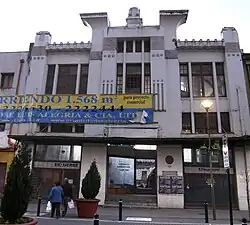 Fachada de la Casa Esquerre con aviso entorpeciendo su apreciación. Representante del art decó en la ciudad de Concepción.