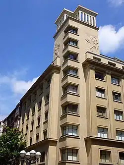 ![]() Edificio de oficinas de 1947 de Rafael Fontán Sáenz, en la confluencia de las calles Diputación y Arbieto de Bilbao. | ||