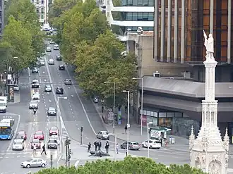 En el número 31 de la calle, ya a la altura de la plaza de Colón, se alzan las Torres de Colón, obra del arquitecto Antonio Lamela.[5] A sus pies, debajo del voladizo, está ubicada Herón, una pieza escultórica de 1975 encargada por dicho arquitecto al escultor albaceteño José Luis Sánchez para rellenar ese espacio. También, en una isleta que cruza la calle se encuentra Mujer con espejo, del colombiano Fernando Botero.
