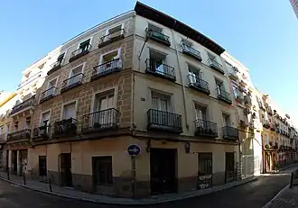 ![]() Edificio en el angulado recodo frente al número 12, en el límite de la Escuela Oficial de Idiomas "Goya", de la Comunidad de Madrid. | ||
