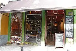 Entre los establecimientos de comercio y ocio que hubo o se conservan en esta calle pueden mencionarse el café de la Vizcaína, en el número 5 de esta calle, frente al pasaje, desde el año 1851. La Vizcaína cambió de nombre y dueños en las postrimerías del siglo xix, pasando a llamarse Café de la Victoria, un local con «mesas de billar a 50 céntimos la hora» y «exquisito café al precio de 40 céntimos a domicilio», según anunciaban en la prensa de la época los nuevos propietarios del traspaso, Severo Belmonte y Juan Fernández Sanseroni.[7] Por unos años mudó su nombre, pasando a llamarse Café del Pasaje (hacia 1905), volviendo a recuperar en 1910 el de la Victoria. En 1932 pasó a ser La Eritaña,[a] “colmao” andaluz y cervecería, y en la década de 1970 se reformó como Venta El Buscón, bar restaurante con una vistosa azulejería, incluido un panel representando a un personaje de la estética noventayochista de Ignacio Zuloaga.[7]
