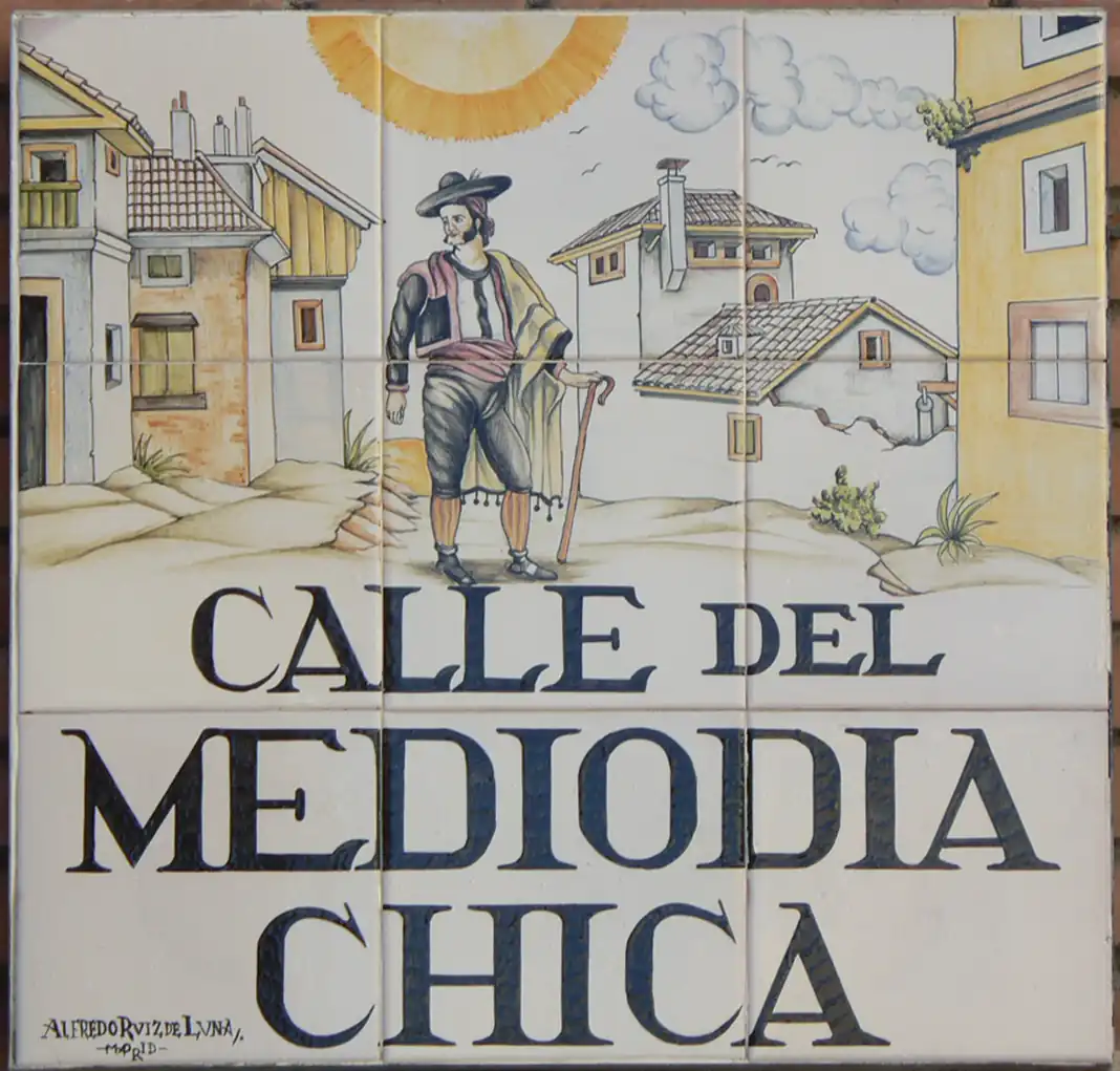 Mediodía Chica. Desde la calle del Mediodía Grande á la de Calatrava. En el plano de Texeira aparece, pero sin nombre; en el de Espinosa con el actual. Se conservan antecedentes de construcciones particulares desde 1693. Tanto esta calle como la siguiente[a] tomaron el nombre por su posición geográfica. La tradición asegura que el terreno de las dos calles era un cerrillo en tiempo de moros, que se denominaba del Mediodía, y á cuyo pie se hallaba el camino que conducía á las alquerías mozárabes.(Peñasco de la Puente y Cambronero, 1889, p. 326)