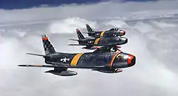 El as estadounidense con más derribos de la guerra, el capitán Joseph C. McConnell, reivindicó 16 derribos, incluyendo tres en un día. Su historia es presentada en una película llamada The McConnell Story, protagonizada por Alan Ladd y June Allyson.[6] El segundo as con más derribos, el comandante James Jabara, fue el primer as estadounidense de aviones a reacción contra aviones a reacción. Otro as, Frederick C. "Boots" Blesse, se adjudicó nueve MiG-15 en su F-86 Sabre[7] y más tarde escribió el libro No Guts, No Glory (en español: Sin Agallas no hay Gloria), un manual sobre el combate aéreo con aviones de caza que aún hoy es estudiado.[5]