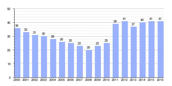 | Gráfica de evolución demográfica de Callejo de Ordás[3] entre 2000 y 2016 |