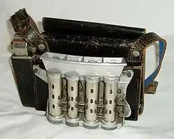La máquina de cambio[27] o dispensador de moneda es un dispositivo mecánico que proporciona monedas a cambio de otras de distinto valor o procedencia, o bien el "cambio" o "vuelta".[28] Puede tener distintas formas. La inventada por Jacques L. Galef se podía llevar en el cinturón, utilizándose por cobradores de los transportes públicos y otras profesiones en las que es necesario el cobro manual.[29]