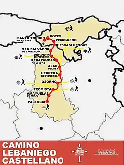 Este camino se basa en la antigua calzada de Toledo a Liébana, el Camino Lebaniego Madrileño, aprovecha la calazada romana desde Madrid por Segovia en este caso la Vía XXIV, por el actual Camino de Santiago de Madrid hasta Villalón de Campos y desde aquí sigue por Villada y Saldaña a enlazar con el Camino Lebaniego Castellano en Cervera de Pisuerga, otra variante enlaza en Valladolid o en Medina de Rioseco, por el canal de Castilla con el Camino Lebaniego Castellano.