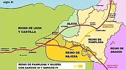 Sancho el Mayor desvió el camino durante el primer tercio del siglo XI e hizo que su trazado pasara más al sur por un terreno despejado, donde previamente —por necesidades militares— había desarrollado un itinerario protegido con fortalezas que discurría por La Rioja.[8] El nuevo atravesaba los valles del Arga, río Salado y Ega para llegar, inicialmente, hasta algún punto cerca de Logroño, donde cruzaba el Ebro y, a partir de 1095, por la propia ciudad tras repoblarse y repararse su puente.[9] Desde ahí se dirigía a Nájera, continuaba hasta Burgos y, poco antes de llegar, se unía de nuevo con la antigua calzada romana, aunque al salir de la ciudad volvía a abandonarla para proseguir por un camino alternativo hasta Carrión.[10]