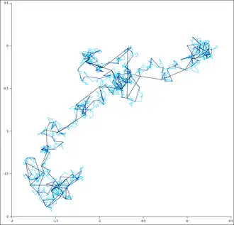 La caminata aleatoria o paseo aleatorio o camino aleatorio, abreviado en inglés como RW (Random Walks), es una formalización matemática de la trayectoria que resulta de hacer sucesivos pasos aleatorios. Por ejemplo, la ruta trazada por una molécula mientras viaja por un líquido o un gas, el camino que sigue un animal en su búsqueda de comida, el precio de una acción fluctuante y la situación financiera de un jugador pueden tratarse como una caminata aleatoria. El término caminata aleatoria fue introducido por Karl Pearson en 1905.[1] Los resultados del estudio de las caminatas aleatorias han sido aplicados a muchos campos como la computación, la física, la química, la ecología, la biología, la psicología o la economía.[2][3][4][5][6][7][8][9] En particular en este último campo la teoría del paseo aleatorio de Burton G. Malkiel en su obra Un paseo aleatorio por Wall Street se fundamenta en la hipótesis de los mercados eficientes, desarrollado en tres formas o hipótesis. En física el modelo ha servido, por ejemplo, para modelar el camino seguido por una molécula que viaja a través de un líquido o un gas (movimiento browniano). En ecología, se emplea para modelar los movimientos de un animal de pastoreo, etc. Varios tipos diferentes de caminos aleatorios son de interés. A menudo, los caminos aleatorios se suponen que son cadenas de Márkov o proceso de Márkov, pero otros caminos más complicados también son de interés. Algunos caminos aleatorios se dan en grafos finitos, otros en la recta, en el plano, o en dimensiones mayores, mientras algunos caminos aleatorios se dan en grupos.