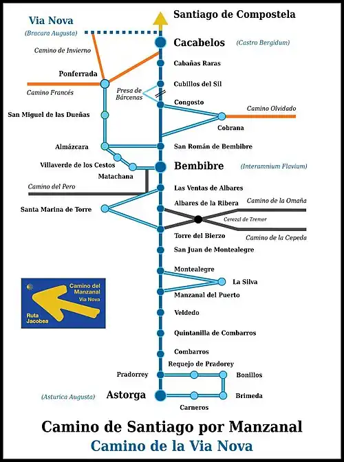 En torno al camino de la Via Nova o de Manazanal, heredero de las vías 20, 19 y 18 del Itinerario de Antonino, que recorren el mismo trazado entre Asturica Augusta y Bergidum,[nota 1] se conforma un entramado de veredas, sendas, caminos, que confluyen en esta ruta principal, actuando la misma como eje estructurante de un abanico de alternativas para el peregrinaje, como el Camino de la Cepeda, en que confluye, a su vez, el Camino de Künig, o la Ruta del Pero, la Ruta de la Omaña, el Camino Olvidado y, ya en los últimos kilómetros, el Camino francés, o el Camino de invierno o Camino de la Ribera Sacra, que comparte parte de la Via Nova, ya en derivación hacia la comarca de Valdeorras, hacia la provincia de Orense.[23]