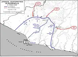 Luego del éxito estadounidense en Guadalcanal en febrero de 1943, las fuerzas aliadas avanzaron sobre la cadena de las Islas Salomón y a finales de 1943 comenzaron la Campaña de Bougainville como parte de la Operación Cartwheel.[10] Cuando comenzaron las primeras ofensivas aliadas, el número estimado de soldados japoneses en Bougainville variaba ampliamente, desde 45 000 hasta 65 000 miembros del ejército, la marina y personal de trabajo.[3][Nota 4]