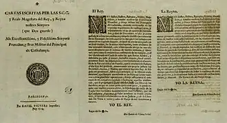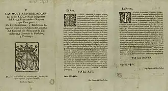 Asimismo los diputados de la Diputación del General publicarían dos opúsculos propagandísticos: el Despertador de Catalunya en catalán, y Crisol de Fidelidad en castellano. En ambos textos se intentaba legitimar la rebelión de Cataluña —o, según su parecer, la continuación de la guerra bajo la jurisdicción de Carlos de Austria—, proclamando que luchaban no solo por su libertad y sus privilegios sino que, recordando la abolición de los Fueros del reino de Aragón y del reino de Valencia, también luchaban por la Corona de Aragón y por libertar a toda España del absolutismo de Felipe V.[85] Para el historiador borbónico Nicolás de Jesús Belando «Vivían con esperanza de que el señor Archiduque, cuando ocupase con sosiego el Trono del Imperio Alemán, les favorecería y los dejaría en entera libertad, reduciéndoles a una independiente república como ya lo expresó a los barceloneses su obispo, el eminentísimo Cardenal Sala».[29]