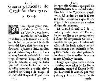 La Campaña de Cataluña (1713-1714) constituye, junto con la toma borbónica de Mallorca, la última fase de la guerra de sucesión española.[1] Mientras se negociaban en Utrecht los tratados que habrían de poner fin a la guerra, Felipe V, presionado por la reina Ana de Inglaterra, concedió el indulto general a los catalanes,[2][3][4] pero en el mismo no se comprometió a mantener sus leyes e instituciones propias, ni concedió la amnistía, tal como le solicitaban los británicos. Finalmente el gobierno de Londres, cuya prioridad era poner fin cuanto antes a la guerra, cedió y presionó a los austriacos para que firmaran el Convenio para la evacuación de Cataluña,[2][5] al que siguió el Convenio del Hospitalet[6] por el que las tropas imperiales abandonaban el Principado de Cataluña,[7] dejando pendiente la solución del llamado «Caso de los Catalanes» (que se concediera una amnistía a los catalanes austracistas y que se mantuvieran sus leyes e instituciones propias).[6]