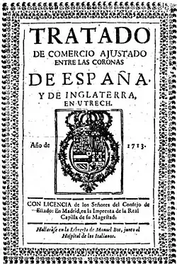 El embajador español en Londres alertó a la corte de Madrid de que «ha llegado aquí el marqués de Montnegre, diputado de Cataluña, con comisiones de proponer que se formase una república del Principado de Cataluña»,[46] aunque el embajador informó que rápidamente había conseguido infiltrarle a un espía entre sus criados «de forma que estoy informado puntualmente de todos sus pasos y he prevenido de todo a milord Boligbroke». Finalmente el 14 de mayo de 1713 Monteleón y Bolingbroke hallaron una solución y firmaron el acuerdo, aunque el tratado se mantuvo en secreto hasta su ratificación el 13 de julio de 1713:[47] Felipe V igualaba la oferta hecha por Carlos de Austria a los ingleses años atrás, cediéndoles autorización para el Navío de permiso y el contrato comercial de tráfico de esclavos —el asiento de negros— durante 30 años,[39][48] y la superó añadiéndole también la entrega del peñón de Gibraltar y de la isla de Menorca; a cambio los ingleses se contentaban con el «Indulto y perdón general a los catalanes» —promulgado ya por Felipe V el 30 de marzo—, y el siguiente artículo referente al mantenimiento de las constituciones catalanas (léase el tratado íntegro):
