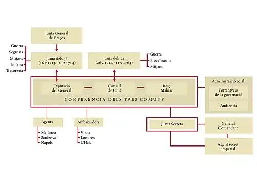 El 15 de septiembre de 1714 fueron abolidos los Tres Comunes de Cataluña —la Diputación del General, el Consejo de Ciento de Barcelona, y el Brazo militar de Cataluña—. Derogadas las Constituciones catalanas Felipe V promulgó los Decretos de Nueva Planta que instauraron el absolutismo en Cataluña. En el informe presentado ante el Consejo de Castilla el intendente José Patiño concluía «los Tres Comunes ruidosos y de más representación de todo el Principado, que sustentaron las turbaciones, por quienes se dirigió la rebelión y resistencia».[22]