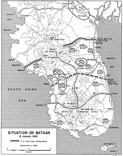 El 7 de enero, la retirada aliada a Bataán fue completada. Los estadounidenses sufrieron unas 13 000 bajas, pero la mayoría fueron filipinos que desertaban.[18] Los japoneses reportaron 627 muertos, 1282 heridos y 7 desaparecidos.[18] Muchas tropas defensoras habían logrado escapar a la pequeña península, los japoneses habían estado tan concentrados en capturar Manila, que descuidaron su flanco derecho, por el que las tropas de MacArthur se escabulleron. En Batán se encontraban apiñados 15 000 soldados estadounidenses y 65 000 filipinos, de estos últimos solamente 10 000 habían recibido un entrenamiento adecuado.[19] Junto con las tropas, miles de civiles entraron a Batán, y se unieron a los lugareños, que no fueron evacuados. En teoría, las fuerzas defensoras debían resistir seis meses en Batán, pero solamente contaban con comida para un mes.[19]