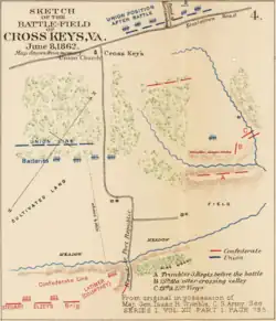 - ↑ Cozzens, p. 499; Clark, p. 170, cita 615 bajas confederadas, 1.018 de la Unión, incluyendo 558 capturados; Kennedy, p. 87, cita 800 confederados, 800-1.000 de la Unión. Krick, pp. 507-12, presenta las bajas detalladas de las batallas combinadas de Cross Keys y Port Republic: Confederación 1.263 (239 muertos, 928 heridos y 96 desaparecidos o capturados), Unión 1.903 (272 muertos, 849 heridos y 782 desaparecidos o capturados). Eicher, p. 266, también da las bajas combinadas: Confederación 1.150 (139 muertos, 951 heridos y 60 desaparecidos o capturados), Unión 1.702 (181 muertos, 836 heridos y 685 desaparecidos o capturados).