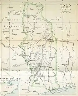 El Imperio alemán había establecido un protectorado sobre Togolandia en 1884, que era algo más grande que Irlanda y tenía una población de alrededor de un millón de personas en 1914. Una cordillera con cimas de más de 910 m atraviesa la región desde el suroeste hasta el noreste y restringe el tráfico entre la costa y el interior. Al sur de la zona alta, el terreno se eleva desde las marismas y lagunas costeras hasta una meseta de unos 61-91 m de altura, cubierta de bosque, hierba alta y matorrales, donde los agricultores habían talado el bosque para cultivar aceite de palma. El clima era tropical, con más precipitaciones en el interior y una temporada seca en agosto.[1]