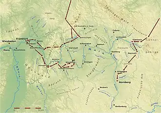 ![]() Recorrido del Ejército prusiano en la campaña del Meno | ||||