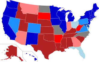 - ↑ Los estados están coloreados según las el promedio de las últimas tres encuestas realizadas para las encuestas para las elecciones presidenciales de los Estados Unidos. Washington, D.C. es demócrata. Si ha habido más de tres encuentras en un sólo mes, entonces ese sería el promedio.