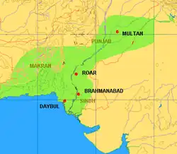 La tercera ola de expansión militar del califato Omeya duró desde 692 hasta 718. El reinado de Al-Walid I (705-715) vio las conquistas más espectaculares de Marwanid Umayyad, en un período de apenas diez años, ya que África del Norte, la península ibérica, Transoxiana y Sindh fueron sometidas y colonizadas.[Bl. 2] Sindh, controlada en ese momento por el rey Raja Dahir de la dinastía Rai, fue capturado por el general omeya Muhammad bin Qasim.[Bl. 3] Si bien Sindh, que paso entonces a ser una provincia de segundo nivel del Califato (iqlim) con capital en Al Mansura, era una base adecuada desde donde podrían organizarse las expediciones militares a la India, después de la partida de bin Qasim, la mayoría de sus territorios capturados fueron recuperados por los reyes indios.[Bl. 4]