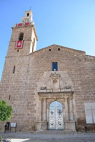 El campanario empezó a construirse en el año 1615, obra que finalizó 5 años después.[4] El material utilizado para su construcción fue la piedra tosca. Se trata de un campanario de planta cuadrada con una altura de 40 metros. Cuenta con 10 campanas, la más antigua data del año 1808 y las más nuevas se colocaron en el año 2003 después de la restauración del campanario. En el año 1857 se le añadió el reloj, que se puede ver desde diferentes puntos de la localidad,.[5][6]