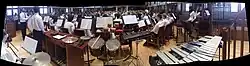 Vista de la sección de percusión de una orquesta desde la parte de atrás de un escenario. Son visibles las campanas tubulares a la derecha.