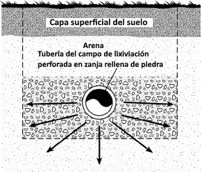 El campo de drenaje generalmente consiste en una disposición de zanjas que contienen tuberías perforadas y material poroso (a menudo grava) cubierto por una capa de tierra para evitar que los animales (y la escorrentía superficial) alcancen las aguas residuales distribuidas dentro de esas zanjas.[1]