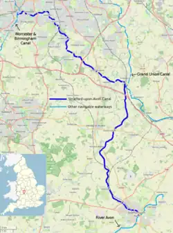 El canal de Stratford-upon-Avon conecta el canal de Worcester y Birmingham en Kings Norton con el río Avon en Stratford-upon-Avon, en Warwickshire. Consta de dos tramos, divididos por un desvío que lo conecta con el Grand Union Canal. La sección norte, desde Kings Norton en los suburbios de Birmingham hasta Lapworth, está nivelada en sus primeras 10,8 millas (17,4 km) de acuerdo con la cota de referencia de Birmingham, que se halla a una altitud de 453 pies (138,1 m) sobre el nivel del mar. Pero a continuación desciende bastante rápido a través del tramo de 18 esclusas de Lapworth, para llegar al cruce. Existe la posibilidad de navegar hacia el canal Grand Union a través de dos esclusas situadas una al lado de la otra (una en la línea principal del canal y otra en un ramal), pero un canal une los extremos inferiores de ambas esclusas. El cruce está casi exactamente a la mitad del canal.[1]