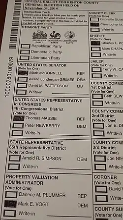 - En 2010, la senadora titular de Alaska, Lisa Murkowski, perdió las primarias republicanas ante Joe Miller.[9] Tras su derrota, se presentó a las elecciones generales como candidata por escrito. Murkowski había presentado y ganado una demanda que exigía a los funcionarios electorales que distribuyeran la lista de nombres de los candidatos por escrito en las urnas y,[10] posteriormente, ganó las elecciones con un margen lo suficientemente amplio sobre Miller y el candidato del Partido Demócrata, Scott T. McAdams, para hacer discutibles las papeletas por escrito que habían sido impugnadas por Miller.[11]