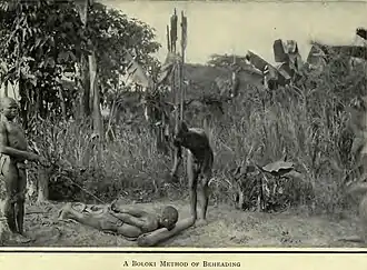 Esta costumbre, que se ha reportado tanto en el centro del río Congo como en el Ubangi en el norte,[100][101] parece haber estado motivada por el deseo de obtener carne fresca en lugar de ahumada, ya que sin refrigeración no había otra forma de evitar que la carne se estropeara rápidamente.[102][103]