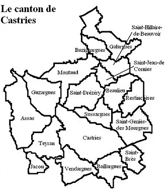 En aplicación del Decreto nº 2014-258[2] de 26 de febrero de 2014, el cantón de Castries fue suprimido el 22 de marzo de 2015 y sus 18 comunas pasaron a formar parte; diez del nuevo cantón de Le Crès, seis del nuevo cantón de Saint-Gèly-du-Fesc, una del nuevo cantón de Lunel y una del nuevo cantón de Montpellier-Castelnau-le-Lez.