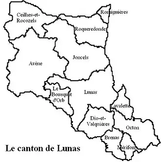 En aplicación del Decreto n.º 2014-258[2] de 26 de febrero de 2014, el cantón de Lunas fue suprimido el 22 de marzo de 2015 y sus 12 comunas pasaron a formar parte; nueve del nuevo cantón de Clermont-l'Hérault y tres del nuevo cantón de Lodève.