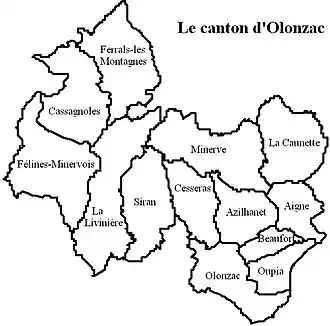 En aplicación del Decreto nº 2014-258[2] de 26 de febrero de 2014, el cantón de Olonzac fue suprimido el 22 de marzo de 2015 y sus 13 comunas pasaron a formar parte del nuevo cantón de Saint-Pons-de-Thomières.
