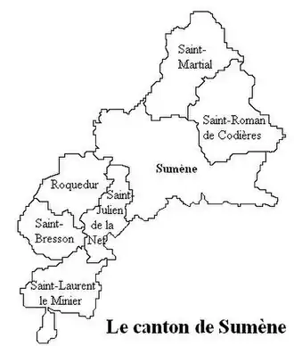 En aplicación del Decreto n.º 2014-232[2] de 24 de febrero de 2014, el cantón de Sumène fue suprimido el 22 de marzo de 2015 y sus 7 comunas pasaron a formar parte del nuevo cantón de Le Vigan.