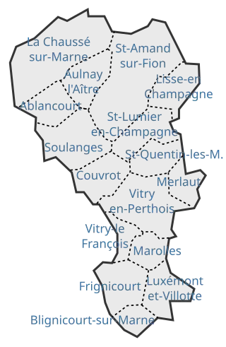 En aplicación del Decreto nº 2014-208[2] de 21 de febrero de 2014, el cantón de Vitry-le-François-Este fue suprimido el 22 de marzo de 2015 y sus 16 comunas pasaron a formar parte; nueve del nuevo cantón de Vitry-le-François-Champaña y Der y siete del nuevo cantón de Sermaize-les-Bains.